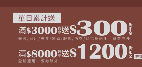 - 折價券每券限使用單件商品一次,逾期視同自動作廢,訂單取消、退貨亦無法再次使用。加價購、服務性票券、汽機車、旅遊、保險、禮券等專案商品,恕不適用本折價券。