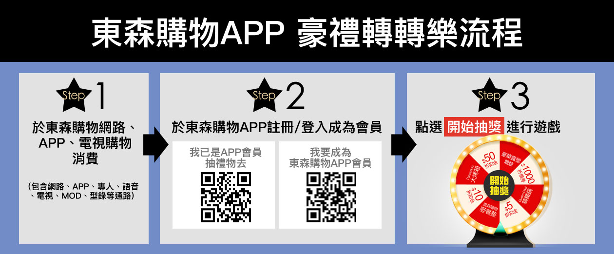 1.活動期間於森森購物不限金額消費即可至森森購物APP進行豪禮轉轉樂活動(含網路、電視、MOD、型錄、專人、語音方式下單)