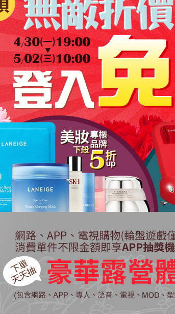 95折,限保養彩妝/美髮/香氛商品/保健/窈窕美形/醫療商品適用(5/2 10AM止,專案商品除外) |