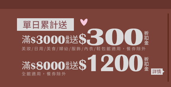滿1000折100,限女裝/男裝/機能服/休閒牛仔/大尺碼/內衣/塑身衣/睡衣/鞋包/配飾指定商品適用(5/2 10AM止,專案商品除外) |