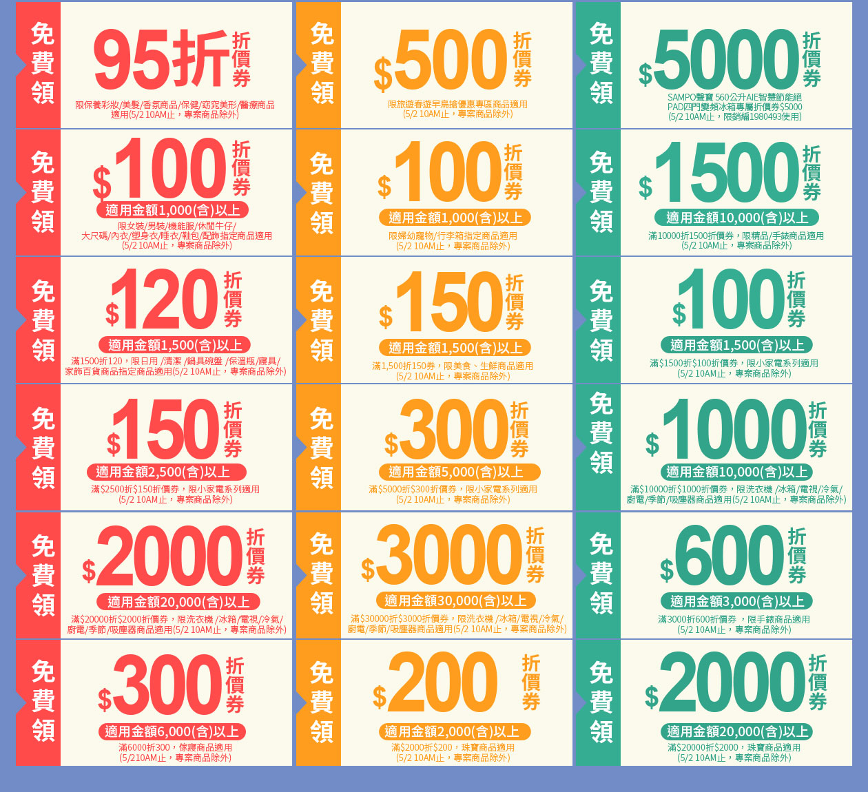 滿$20000折$2000折價券,限洗衣機 /冰箱/電視/冷氣/廚電/季節/吸塵器商品適用(5/2 10AM止,專案商品除外) |