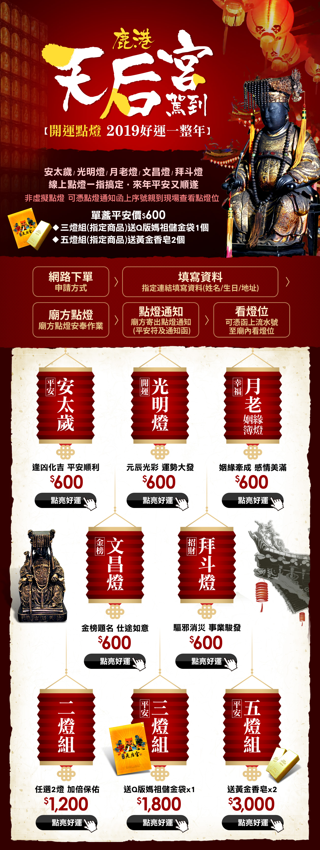 - 選購後請參考點燈步驟前往專屬填單網頁填寫祈福資料。