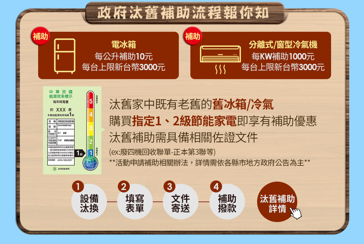 | 冷氣 | 每千瓦補助1000元 | 上限3000元/台 | 需依各縣市經發局公告為主 |