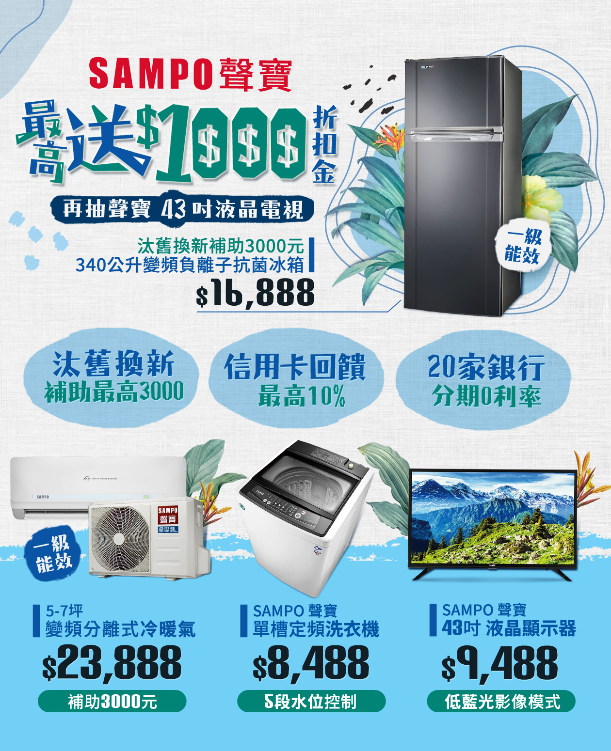 - 活動說明:活動期間凡購買聲寶指定品項(電視/冰箱/洗衣機/冷氣)消費單筆訂單累積發票金額滿以下條件並於表單登記相關資料,符合資格者可獲得折扣金抽獎資格,滿$ 10,000元(含)以上,抽$1,000元折扣金,每個會員限得乙次,恕不累贈。消費完成需於活動頁登記才符合活動資格,未登記完成恕不符合活動資格。(登記抽10名)