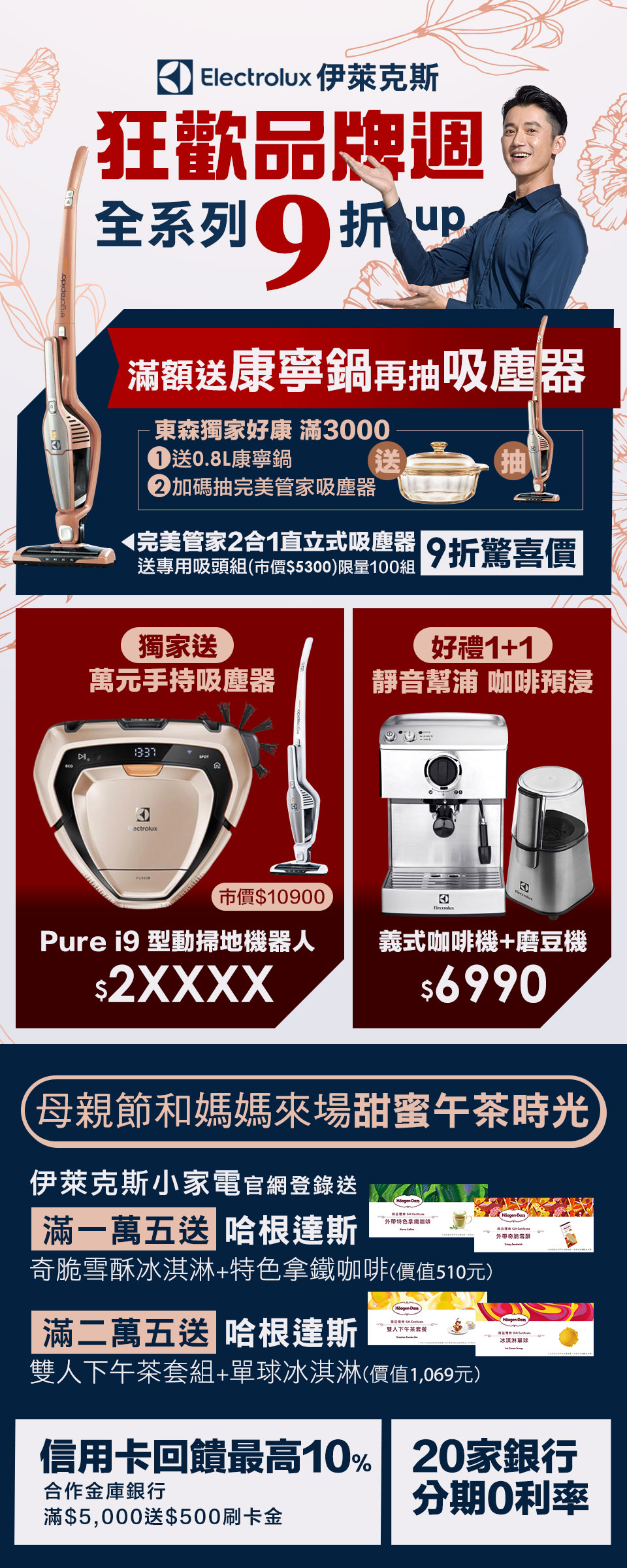 - 4/1 AM00:00-5/31 PM23:59活動期間內,購買伊萊克斯小家電指定商品(限廚房家電、料理家電及清潔家電分類內之指定商品),單筆消費(*單筆消費係以單一發票號碼為準)滿15,000或25,000元,且無取消/退貨者,於活動期間內完成商品登錄(https://www.electroluxlifestyle.com.tw/產品註冊),並且成功,可獲得「哈根達斯午茶組合」。