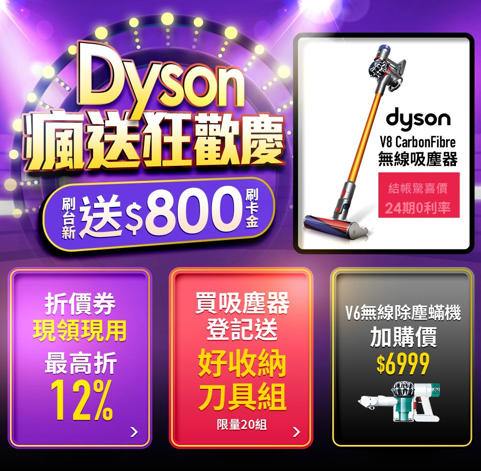 買吸塵器登記送好收納刀具組 活動辦法: 活動期間:05/14 AM00:00-06/30 PM23:59 • 05/14 AM00:00-06/30 PM23:59活動期間內,購買Dyson吸塵器 (V11系列、電視品、福利品、配件除外) 且無取消/退貨者,並於活動登記頁下方登記送好收納刀具組(限量20名),活動結束後7/23統一整理獲獎名單,獎項於7/29統一寄出。 項次 獎項 市售價 名額 訂單區間 1 好收納刀具組 $990 共20名 5/14~6/30