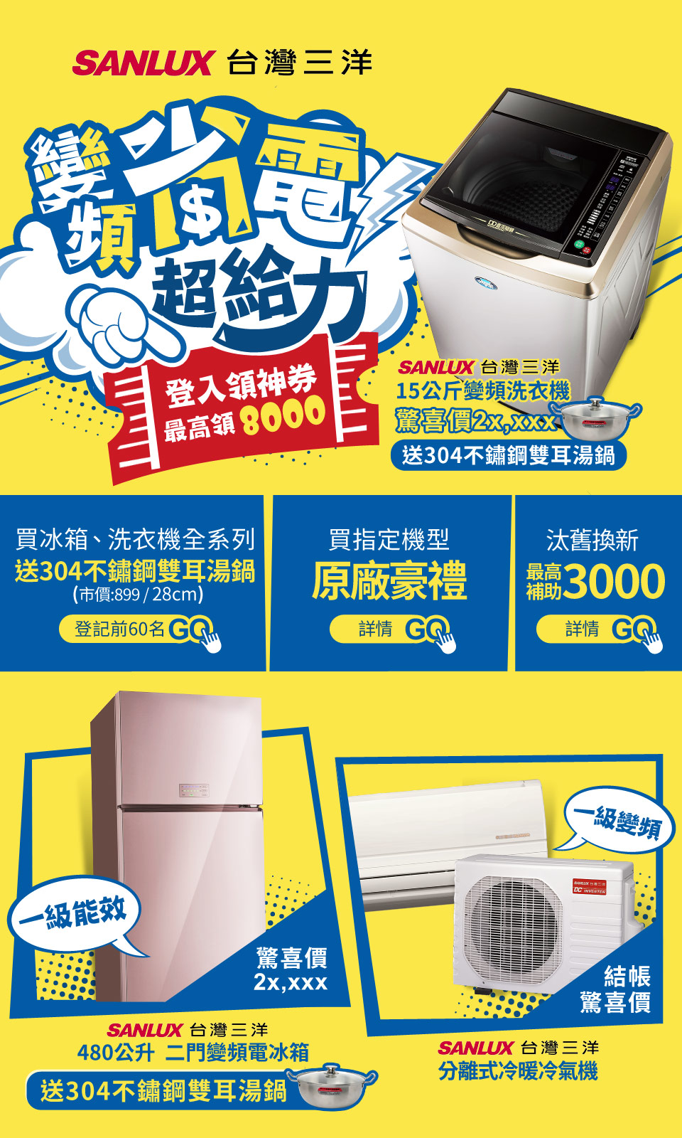 活動說明:活動期間凡購買冰箱、洗衣機全系列條件並於表單登記相關資料,前60名即贈送304不鏽鋼雙耳湯鍋,每個會員限得乙次,恕不累贈。消費完成需於活動頁登記才符合活動資格,未登記完成恕不符合活動資格。