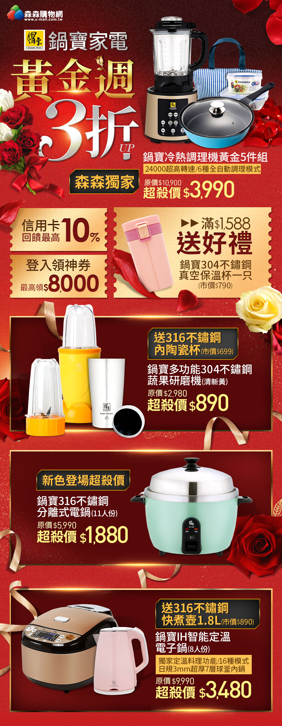 - 活動期間購買鍋寶活動專區商品單筆消費金額滿1588元,即送「鍋寶304不鏽鋼超真空彈跳保溫杯」乙個(顏色隨機)。