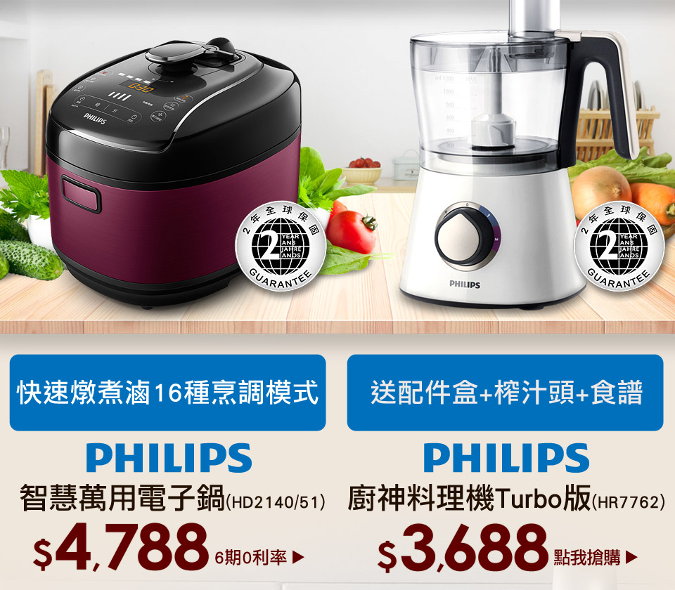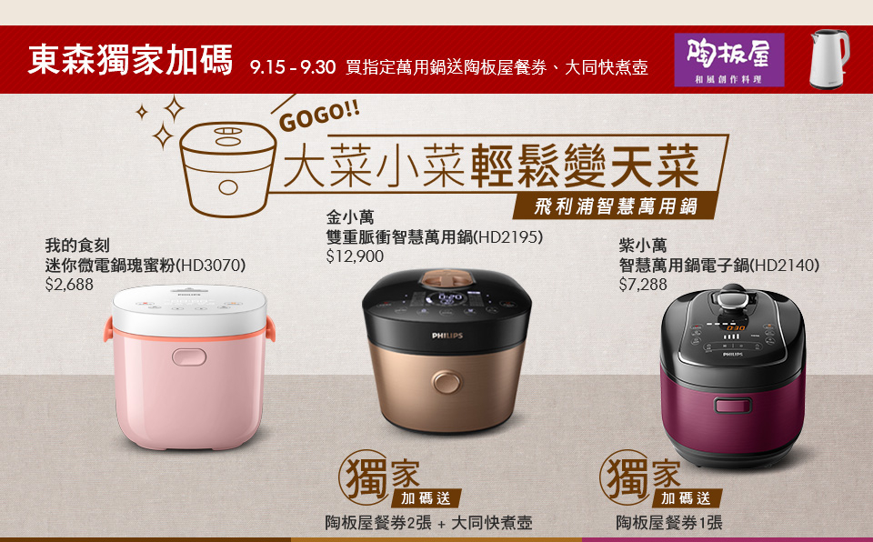 - 活動說明:活動期間凡購買飛利浦指定萬用鍋/電子鍋(電視購物商品除外)符合資格且過鑑賞期未退貨者可獲得陶板屋餐券;購買指定商品單筆訂單滿1萬且符合資格過鑑賞期未退貨者送大同快煮壺。陶板屋限量95張,大同快煮壺限量9台,依下單時間順序發送,贈品數量有限送完為止。