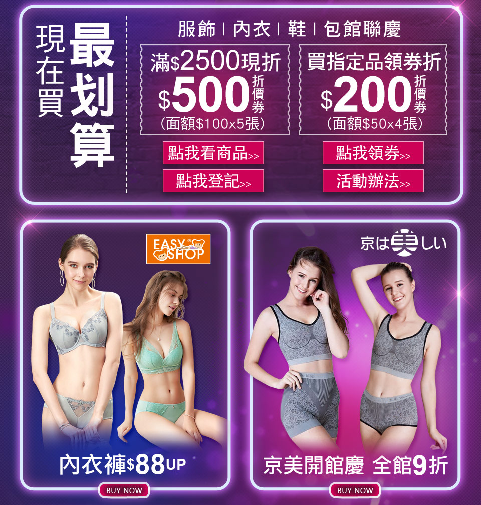 活動一、【流行服飾/內衣/鞋/包消費滿$2500登記送$500折價券】
