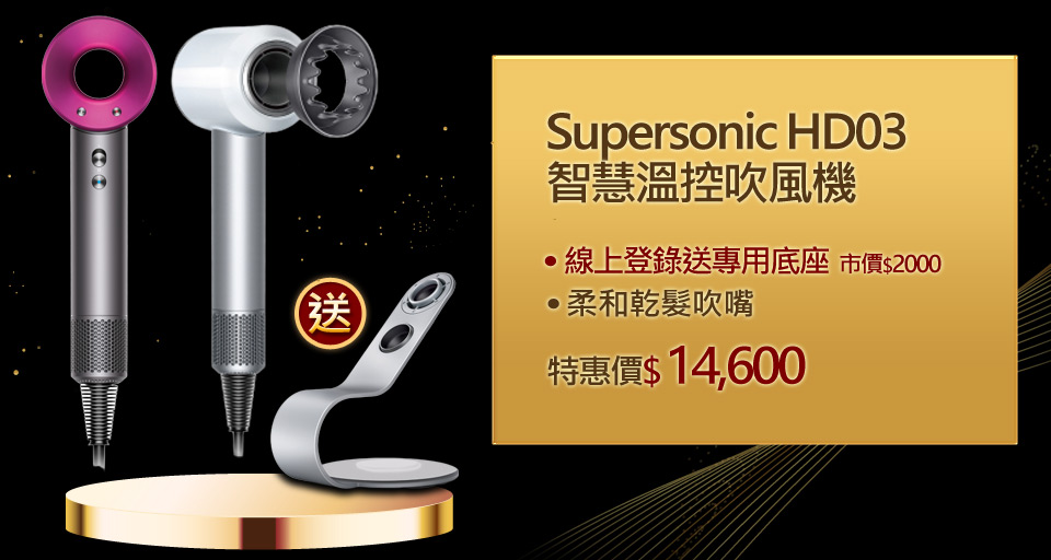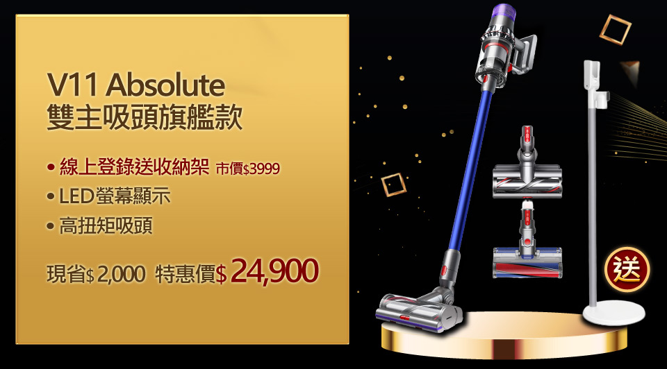 - 活動說明:本活動限購買恆隆行貿易股份有限公司進口產品參加。凡於本活動指定通路購買指定產品(電視商品除外),於本活動登錄截止日(含)前至指定登錄頁完成登記,資格符合者即可獲得登錄好禮(V11 Dok收納架、Dyson 禮券、HEPA濾網等..),詳細活動說明以恆隆行貿易股份有限公司公告為準,恆隆行貿易股份有限公司保有修改活動的權利。 活動登錄網址: http://event.hengstyle.com/dyson/gifts/ 活動參與品號 : 請見贈獎注意事項。