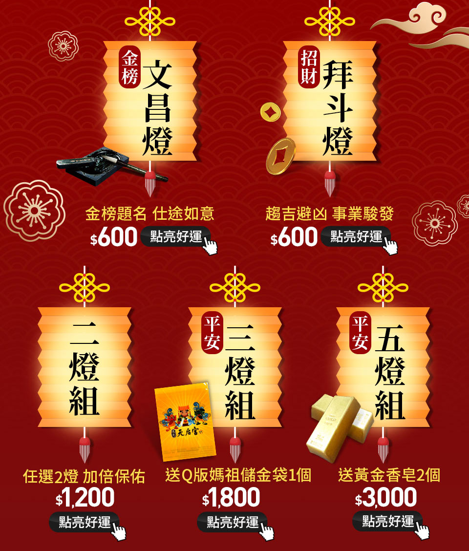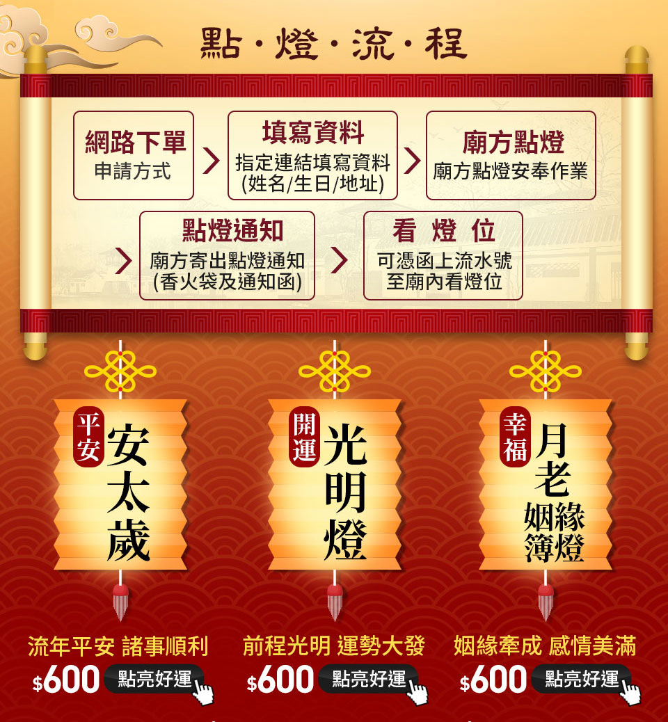 - 選購後請參考點燈步驟前往專屬填單網頁填寫祈福資料。