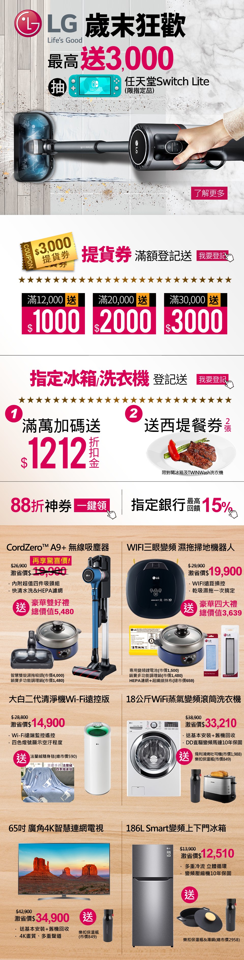 - 活動說明:活動期間凡購買家電館LG活動專區內之指定商品(電視購物商品除外),完成登記並符合資格且過鑑賞期未退貨,單筆訂單滿$12,000元(含),即可獲得1,000提貨券一張;單筆訂單滿$20,000元(含),即可獲得2,000提貨券一張;單筆訂單滿$30,000元(含),即可獲得3,000提貨券一張。登記送3,000提貨券活動僅指定冰箱/洗衣機/電視參與,掃地機及吸塵器不參與。提貨券數量有限(如下表說明),送完為止,贈送名單以登記順序為準;單筆訂單不可累贈,僅可獲得最高門檻之贈品,獎項如下表所示。活動參與品號 : 請見贈獎注意事項。
