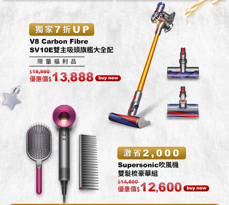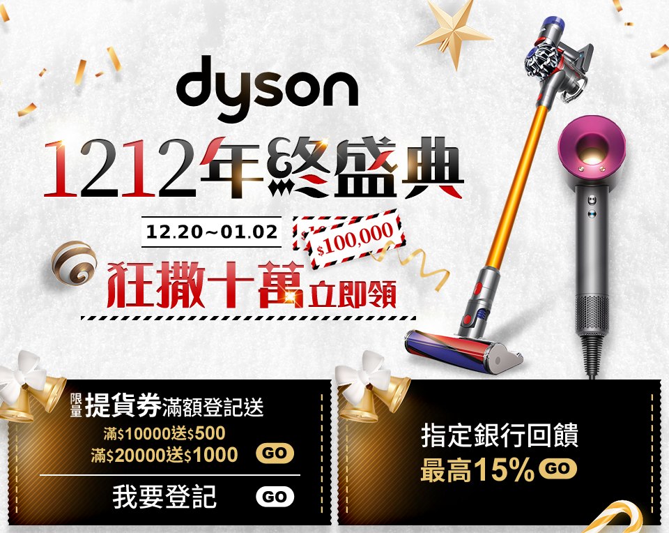 - 活動說明:活動期間凡購買家電館Dyson活動專區內之指定商品(電視購物商品除外),完成登記並符合資格且過鑑賞期未退貨,單筆訂單滿$10,000元(含),即可獲得500電子提貨券一張;單筆訂單滿$20,000元(含),即可獲得1,000電子提貨券一張。電子提貨券數量有限(如下表說明),送完為止,贈送名單以登記順序為準;單筆訂單不可累贈,僅可獲得最高門檻之贈品,獎項如下表所示。