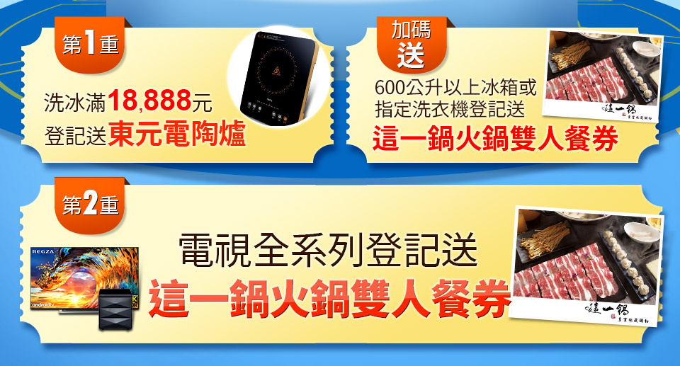 | 這一鍋雙人套餐券 | 購買TOSHIBA東芝600公升以上冰箱或洗脫烘滾筒洗衣機並完成登記 (單筆訂單限可獲得一組,恕不累贈) |