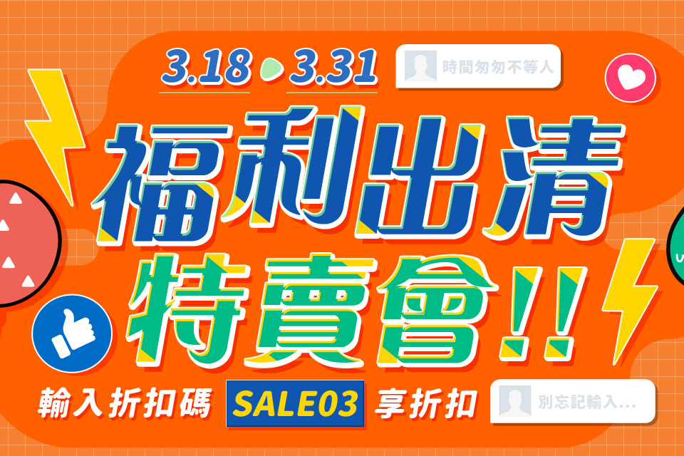 活動內容:活動期間於活動「福利品出清特賣會」中消費指定商品,並於購物車結帳頁面中輸入結帳折扣碼『SALE03』,即可折抵$100,每一會員限使用乙次。